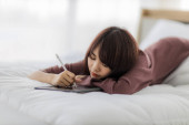 Zdjęcie "Kobieta grająca na tablecie na łóżku w białej sypialni" może być wykorzystywane do celów osobistych i komercyjnych zgodnie z warunkami zakupionej licencji Royalty-free. Obraz jest dostępny do pobrania w jakości wysokiej rozdzielczości do 5760x3840.