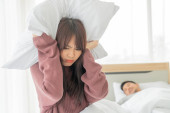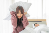 Zdjęcie "para w łóżku mężczyzna śpi i chrapie podczas gdy kobieta nie jest w stanie spać zamykając uszy z dużymi poduszkami, kobieta blokując uszy poduszką podczas gdy mężczyzna chrapie na łóżku" może być wykorzystywane do celów osobistych i komercyjnych zgodnie z warunkami zakupionej licencji Royalty-free. Obraz jest dostępny do pobrania w jakości wysokiej rozdzielczości do 5760x3840.