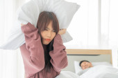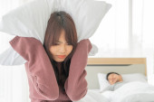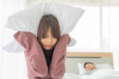 para w łóżku mężczyzna śpi i chrapie podczas gdy kobieta nie jest w stanie spać zamykając uszy z dużymi poduszkami, kobieta blokując uszy poduszką podczas gdy mężczyzna chrapie na łóżku