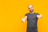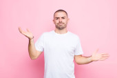 Zdjęcie "młody przystojniak czuje się szczęśliwy, odnoszący sukcesy i pewny siebie, stawiając czoła wyzwaniu i mówiąc przynieś go! lub witając cię pod płaską ścianą" może być wykorzystywane do celów osobistych i komercyjnych zgodnie z warunkami zakupionej licencji Royalty-free. Obraz jest dostępny do pobrania w jakości wysokiej rozdzielczości do 5760x3840.