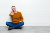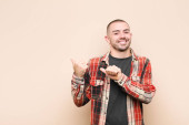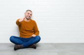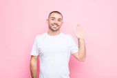 młody przystojniak czuje się szczęśliwy, odnoszący sukcesy i pewny siebie, stawiając czoła wyzwaniu i mówiąc przynieś go! lub witając cię pod płaską ścianą