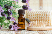 Vintage butelka z korkiem z olejkiem eterycznym (nalewka, wlew, perfumy), liliowe kwiaty i drewniana szczotka do włosów. Aromaterapia, naturalna pielęgnacja włosów, domowe spa i składniki medycyny ziołowej.