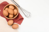 Świeże jajka w starym drewnianym koszu umieścić na białej serwetce. Przygotować świeże jaja kurze do gotowania lub pieczenia na drewnianym drewnianym drewnianym stole. Widok z góry lub płaskie jaj z miejsca na kopiowanie tła lub tapety.
