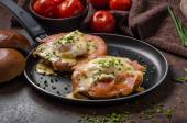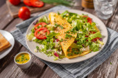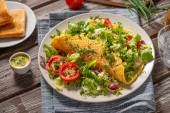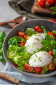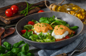 Świeża sałatka z jajkiem benedyktyńskim, pomidorami i pysznym sosem