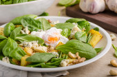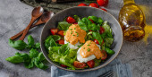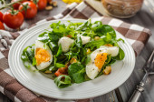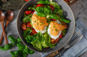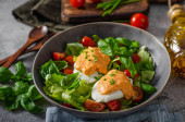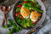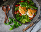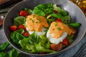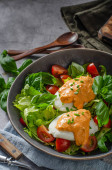 Świeża sałatka z jajkiem benedyktyńskim, pomidorami i pysznym sosem