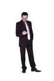 biznesmen z szklankę napoju tekstylny patrząc na kamery