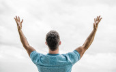 Szczęśliwego zwycięzcy. muskularny tylny człowiek odizolowany na białym. Rozpoczęcie własnej działalności. Biznesowy sukces. Facet czuje się potężny, chce zmienić świat. Jesteśmy zwycięzcami. wdzięczny człowiek za fortunę.