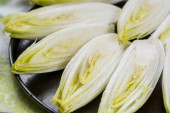 Grupa świeżych surowych zielonych belgijskich endywii lub warzyw hicory, znanych również jako witlof salade close up