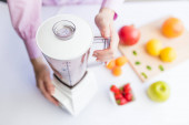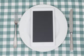 Kobieta korzystająca z tabletu cyfrowego w kuchni, aby znaleźć zdrowy przepis posiłku w Internecie.