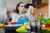 Zdjęcie "Kobieta korzystająca z tabletu cyfrowego w kuchni, aby znaleźć zdrowy przepis posiłku w Internecie." może być wykorzystywane do celów osobistych i komercyjnych zgodnie z warunkami zakupionej licencji Royalty-free. Obraz jest dostępny do pobrania w jakości wysokiej rozdzielczości do 5760x3840.