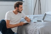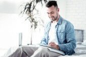 Poważny mężczyzna z pamiętnikiem analizującym jego notatki