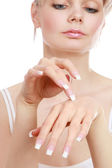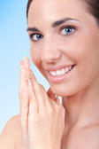 piękna kobieta jest nałożeniem kremu na twarzy przez biały