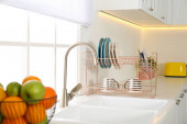 Zdjęcie "Czyste naczynia na suszarce w nowoczesnym wnętrzu kuchni" może być wykorzystywane do celów osobistych i komercyjnych zgodnie z warunkami zakupionej licencji Royalty-free. Obraz jest dostępny do pobrania w jakości wysokiej rozdzielczości do 5760x3840.