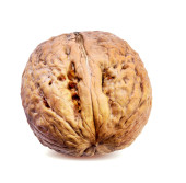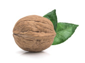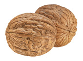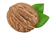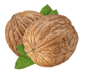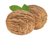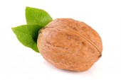 Orzech włoski izolowany na białym tle. Jedno zbliżenie orzechów z zielonymi liśćmi. Orzechy organiczne