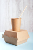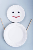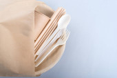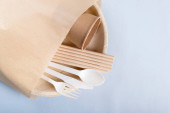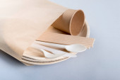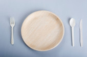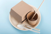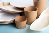Biodegradowalne jednorazowe potrawy na jasnoniebieskim tle. Koncepcja recyklingu