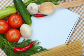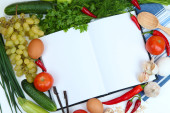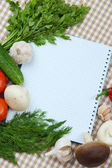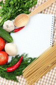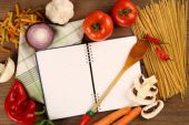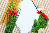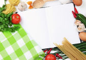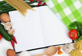 gotowania. Artykuły spożywcze z pustym książki kucharskiej z bliska