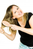 młoda zaszokowana kobieta z różowymi włosami na białym tle