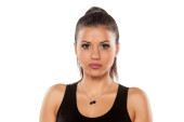 młoda uśmiechnięta kobieta z różowymi włosami na białym tle
