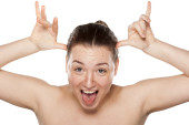 młoda zabawna kobieta z różowymi włosami na białym tle