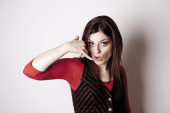 Pół portret młodej zmartwionej kobiety z różowymi włosami na różowym tle