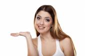 młoda uśmiechnięta kobieta z różowymi włosami na żółtym tle