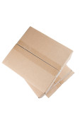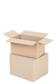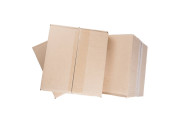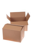 odizolowane zbliżenie trzech ułożonych zamkniętych prostokątnych, pustych, brązowych pudełek kartonowych na białym tle