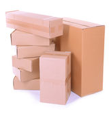 odizolowane zbliżenie trzech ułożonych zamkniętych prostokątnych, pustych, brązowych pudełek kartonowych na białym tle