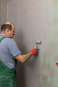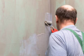 Remont łazienki. Pracownik budowlany. Izolacja wilgotności mineralnej. Podczas pracy.