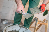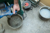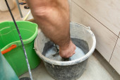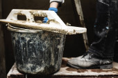 Buty robocze dla pracowników fizycznych. Drewniana drabina. Wiadro wypełnione izolacją przeciwwilgociową.