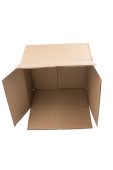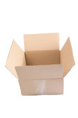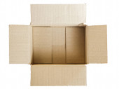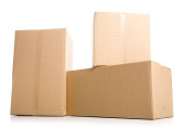 odizolowane zbliżenie trzech ułożonych zamkniętych prostokątnych, pustych, brązowych pudełek kartonowych na białym tle