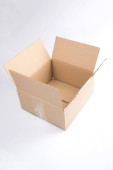 odizolowane zbliżenie trzech ułożonych zamkniętych prostokątnych, pustych, brązowych pudełek kartonowych na białym tle