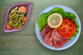 Zdjęcie "szynka z sałatką, pomidorem i cytryną na jasnoniebieskim talerzu. szynka na zielonym drewnianym tle .ham widelec i nóż widok z góry" może być wykorzystywane do celów osobistych i komercyjnych zgodnie z warunkami zakupionej licencji Royalty-free. Obraz jest dostępny do pobrania w jakości wysokiej rozdzielczości do 5760x3840.
