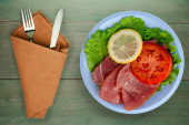 szynka z sałatką, pomidorem i cytryną na jasnoniebieskim talerzu. szynka na zielonym drewnianym tle .ham widelec i nóż widok z góry