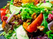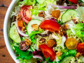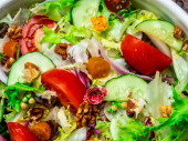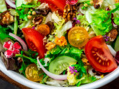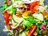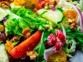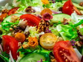 Sałatka z różnych rodzajów sałaty, pomidorów, cebuli, ogórków i orzechów.