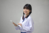 Portret tajskiej uczennicy szkoły średniej mundur piękna dziewczyna za pomocą tabletu
