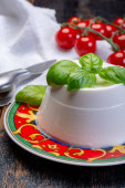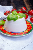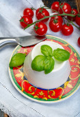 Włoski ser miękki, młody biały ser ricotta podawany ze świeżą bazylią i smacznymi dojrzałymi pomidorami wiśniowymi