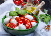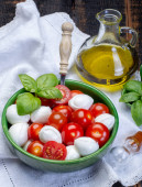 Włoski ser miękki, młody biały ser ricotta podawany ze świeżą bazylią i smacznymi dojrzałymi pomidorami wiśniowymi