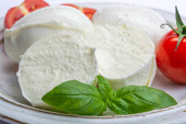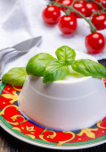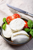 Włoski ser miękki, młody biały ser ricotta podawany ze świeżą bazylią i smacznymi dojrzałymi pomidorami wiśniowymi