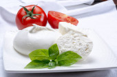 Włoski ser miękki, młody biały ser ricotta podawany ze świeżą bazylią i smacznymi dojrzałymi pomidorami wiśniowymi