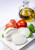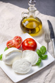 Włoski ser miękki, młody biały ser ricotta podawany ze świeżą bazylią i smacznymi dojrzałymi pomidorami wiśniowymi