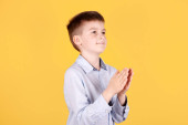 Portret brunetka wskazującego palcem w górę, pomysł, myślenie. Izolacja na żółtym tle.