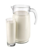 Dzbanek i szklanka całkowicie wypełnione świeżym krowim mlekiem stoją na czystym białym tle.