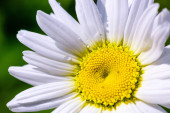 Kwiat rumianku z kroplami wody, białe płatki po deszczu na zielonym tle. Zbliżenie. Makro. Makro zbliżenie rumianku.