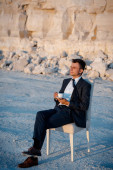 30-letni brunet w szarym stroju na białym tle rozmawiający przez komórkę
