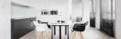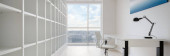 Stylowe biuro domowe z drewnianym biurkiem i korytarzem z oknem i czarną komodą
