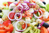 Sałatka warzywna na talerzu, pomidory, sałatka zielona, ser, cytryna i oliwka, inne warzywa. na czarnym tle.