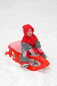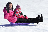 Szczęśliwa dziewczyna sankach, zima, zabawa, śnieg, rodzina sankach