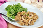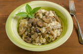 Klasyczne włoskie wegańskie risotto grzybowe wykonane z ryżu arbuzowego, grzyby, cebula i czosnek ozdobione wstążkami bazylii na rustykalnej drewnianej powierzchni z zieloną serwetką i widelcem
