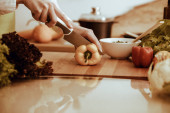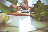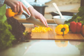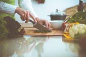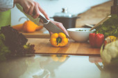 Zdjęcie "Nieznane ludzkie dłonie gotują w kuchni. Kobieta jest zajęta sałatką warzywną. Zdrowy posiłek i koncepcja wegetariańskiej żywności" może być wykorzystywane do celów osobistych i komercyjnych zgodnie z warunkami zakupionej licencji Royalty-free. Obraz jest dostępny do pobrania w jakości wysokiej rozdzielczości do 5760x3840.