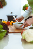 Nieznane ludzkie dłonie gotują w kuchni. Kobieta jest zajęta sałatką warzywną. Zdrowy posiłek i koncepcja wegetariańskiej żywności